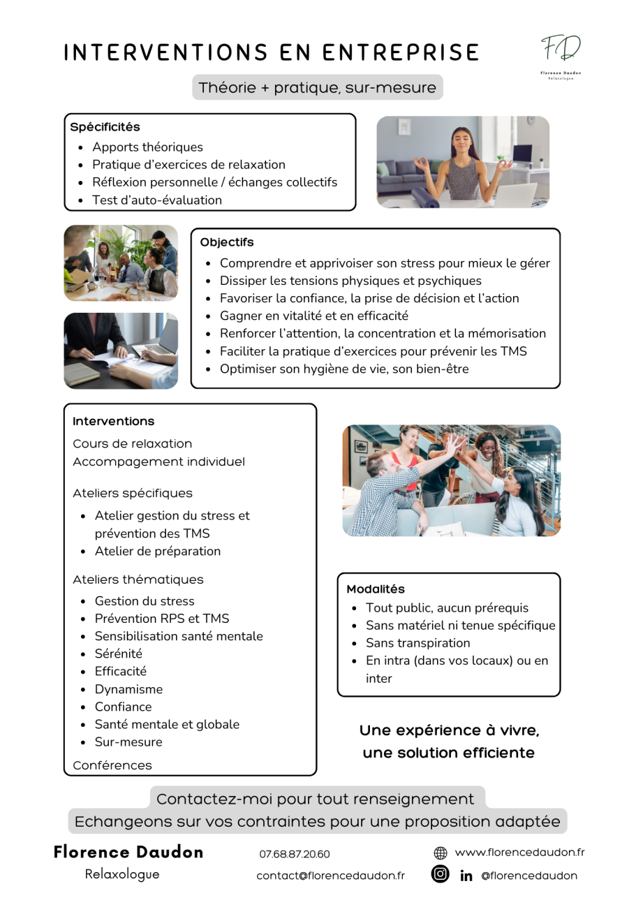Gestion du stress, prévention des TMS et des RPS : je vous propose des solutions variées, adaptées à vos attentes, pour améliorer le bien-être de vos collaborateurs.